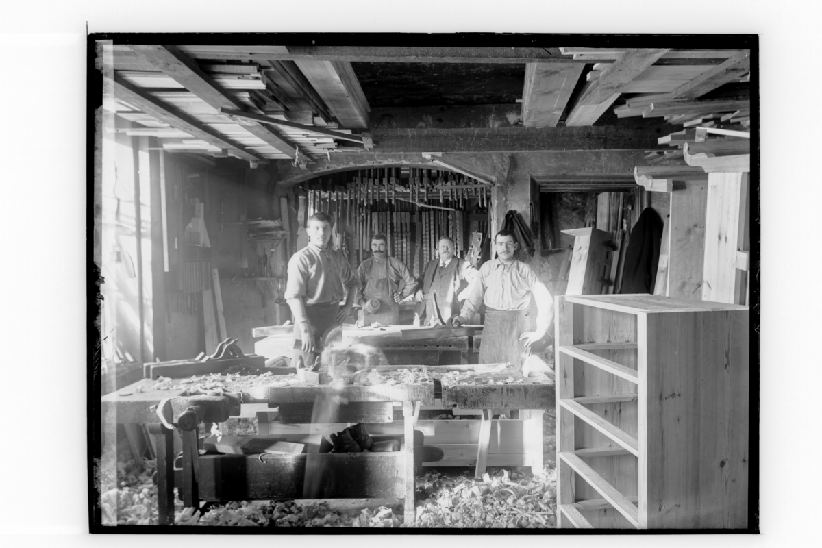 Verkstadsinteriör, 4 män. Snickaremästare J.E. Åhlberg.