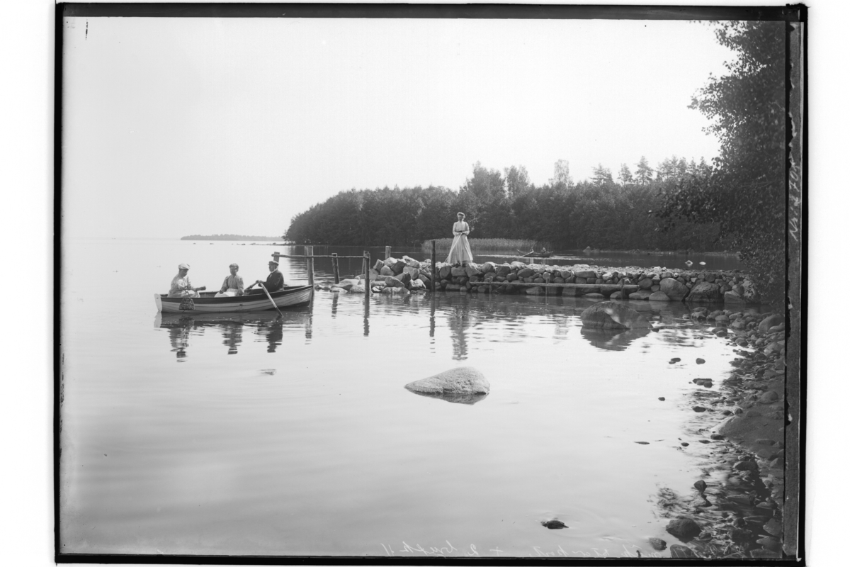 Kräftfiske. En person på stenbryggan vid Hjälmaren, 3 personer i en jolle.