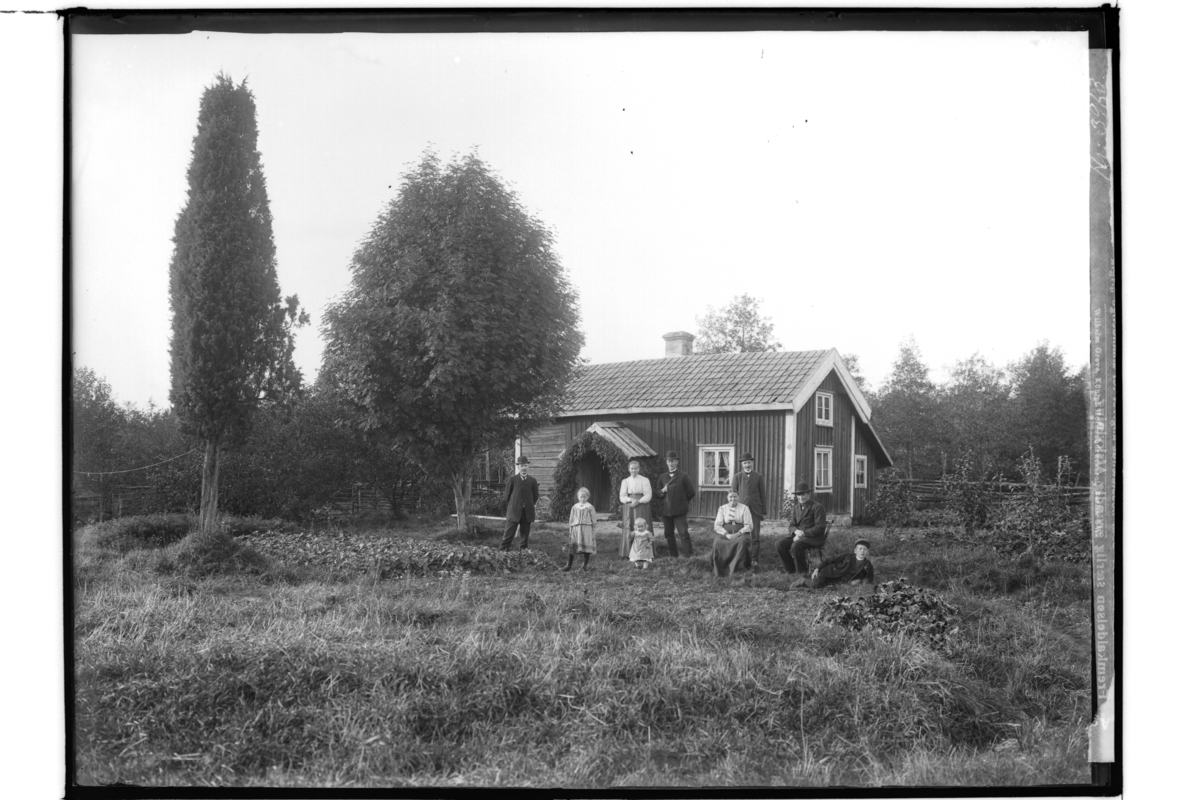 Envånings enkelstuga med tillbyggnad, 9 personer ute på tunet.