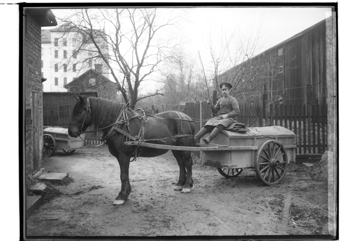 Titel: Örebro Renhållningsverk, häst spänd för tvåhjulig sopkärra. Kusken E. Johansson