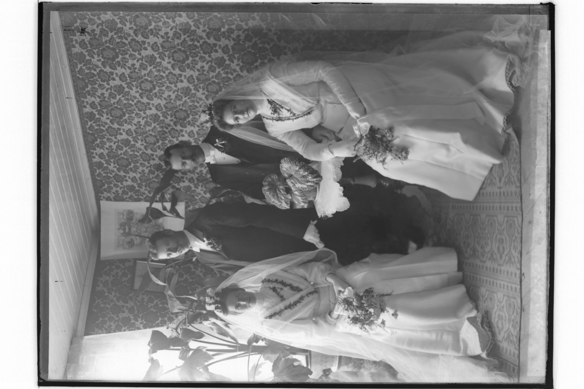 Dubbelbröllop, två brudpar. Brudarna helt i vitt med kronor. Brudgummarna i frack.