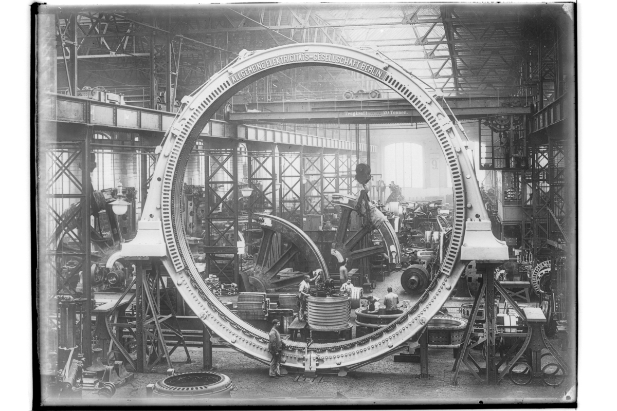 A.E.G. Elektriska (Installationsfirma), interiör av maskinhall, 3 arbetare.