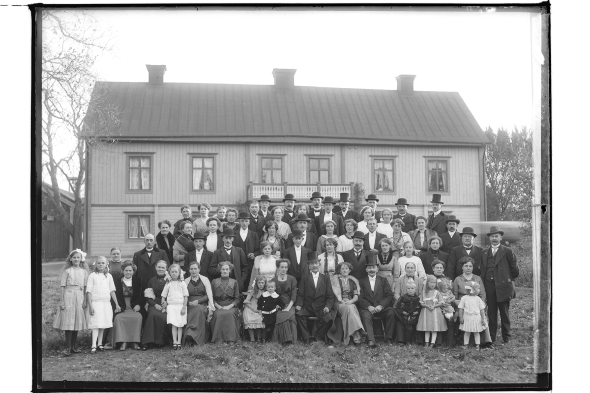 Tvåvånings bostadshus med balkong, 61 personer framför byggnaden.