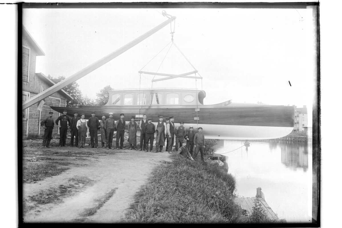 Båtbyggeri, 17 arbetare, sjösättning av motorbåt.