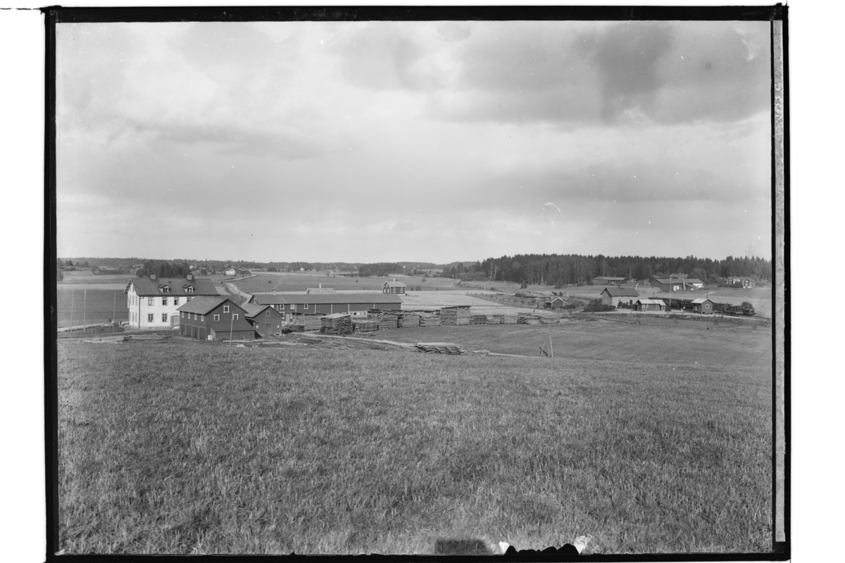 Ångsåg, ekonomibyggnader och brädstaplar.