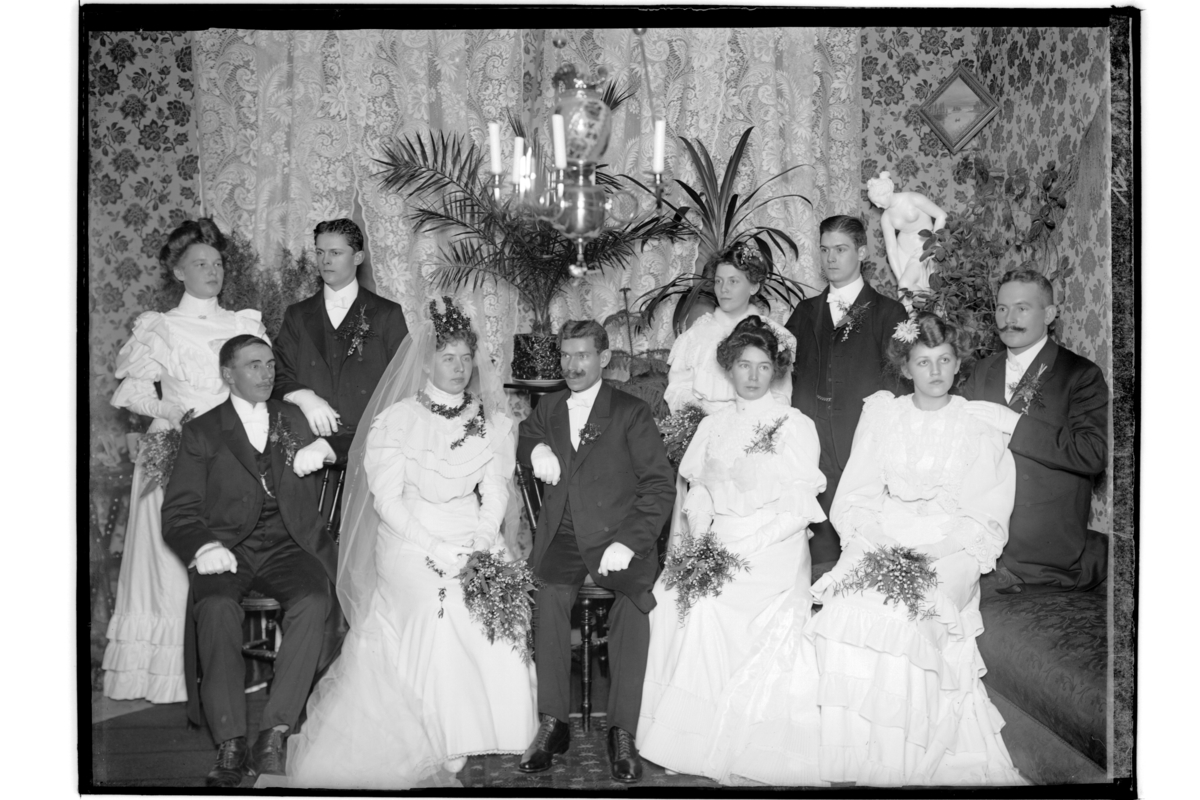 Bröllop, brudpar och bröllopsgäster. Bruden helt i vitt. Brudgummen i frack.