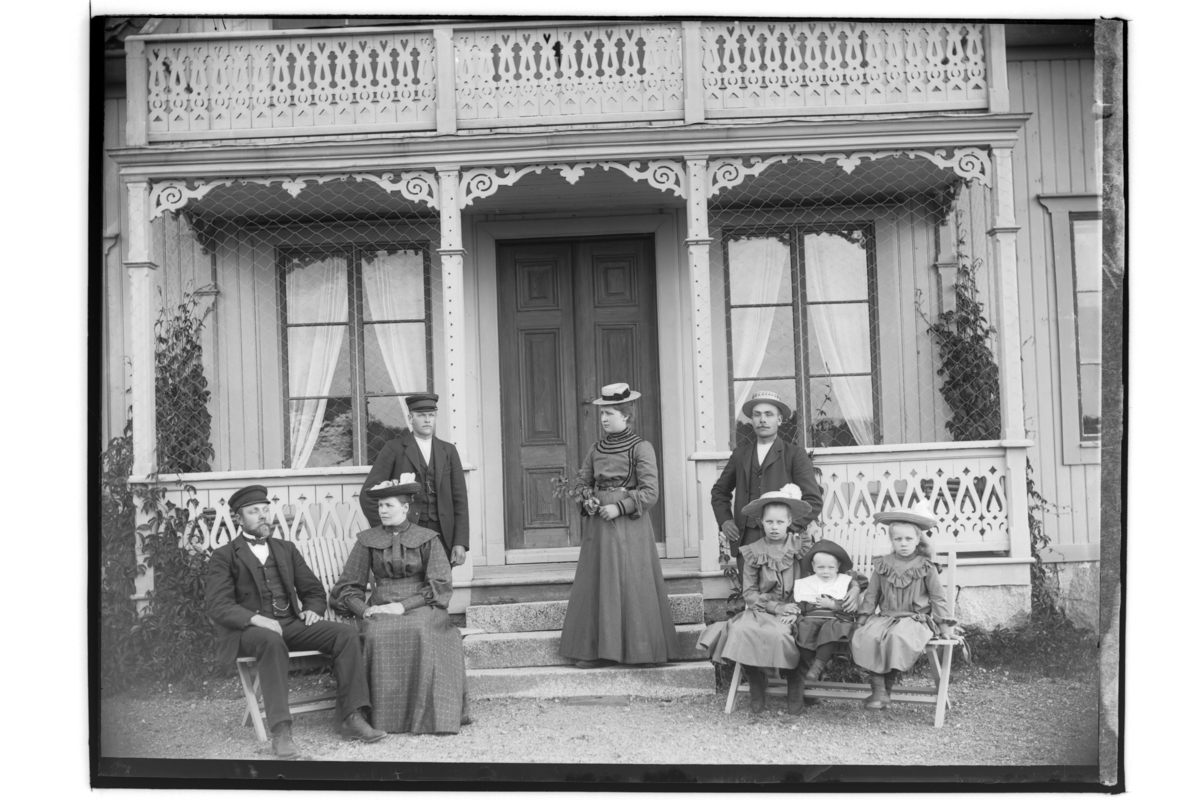 Bostadshus, 8 personer på trappan.