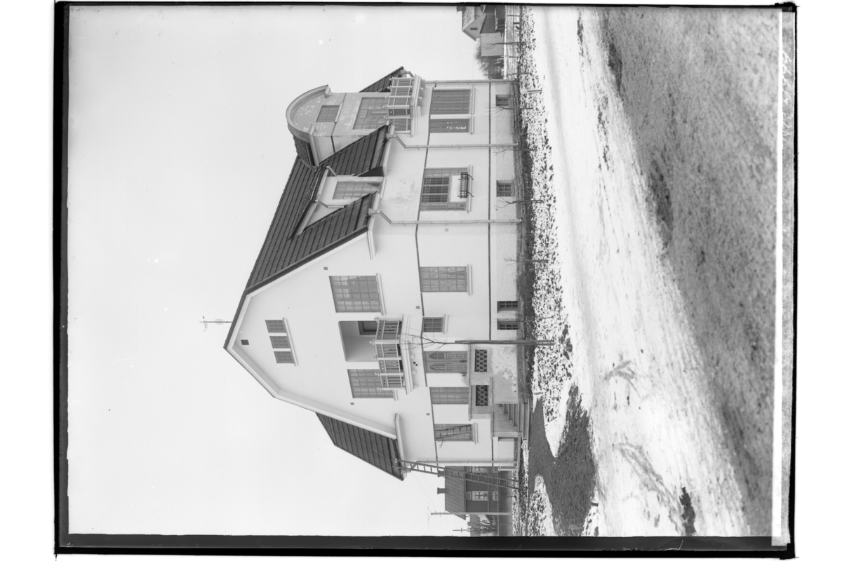 Trähus i en och halvvåning med jugendpräglad fasad. Reveterat.