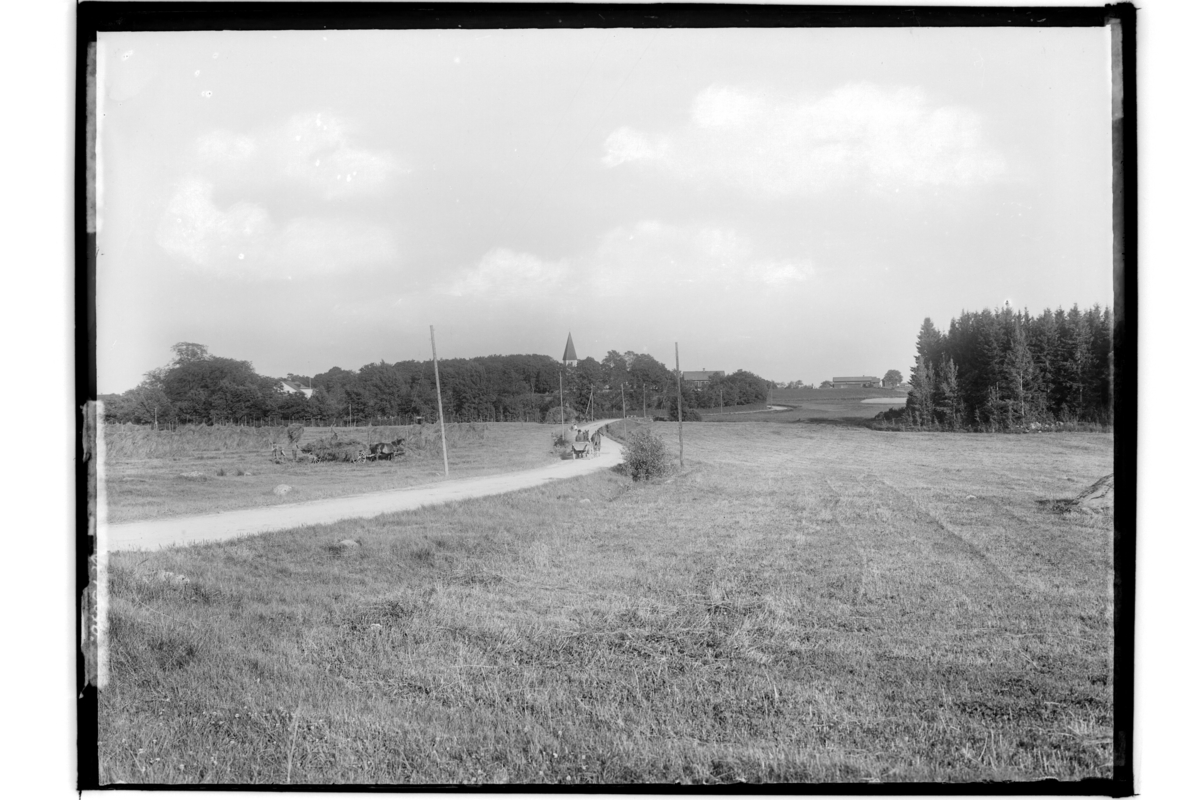 Vy över Norrbyås från Hidingstavägen, kyrkan. Hölass på vägen.