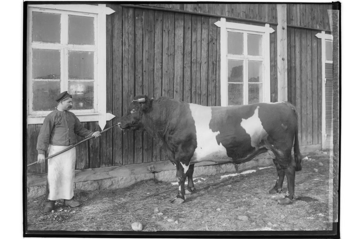 Titel: Segersjö Herrgård, ekonomibyggnad, en man med tjur. Förvaltare H. Sköldebrand