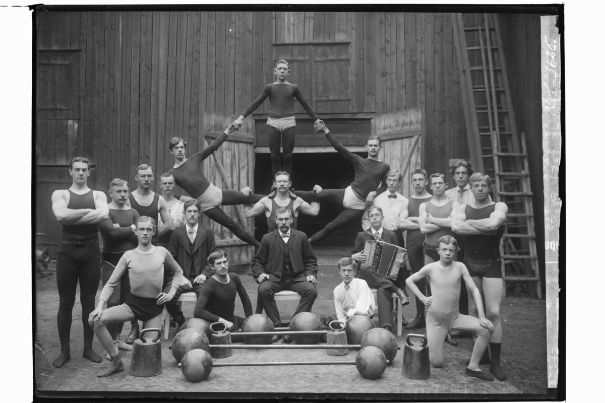 Örebro Atlet & Gymnastikförening, tjugo atleter och gymnaster framför klubblokalen.