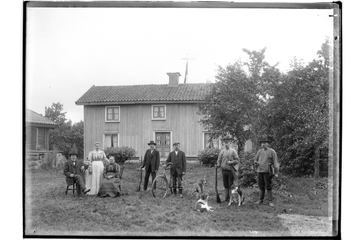 Tvåvånings parstuga, 7 personer och tre jakthundar.