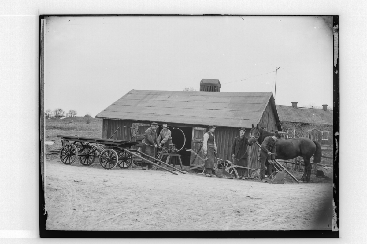 Smedja, fem personer, en häst