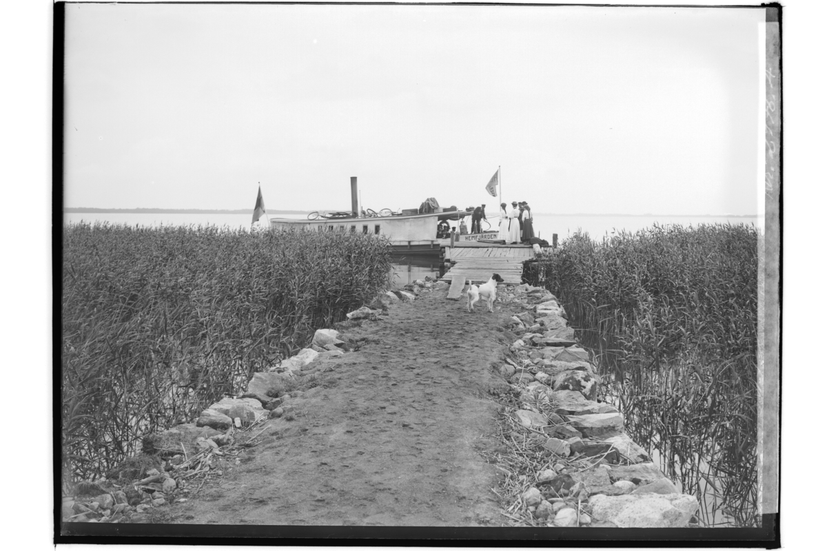 Titel: Ekeby brygga, Ångslupen Hemfjärden angör bryggan, hämtar passagerare.