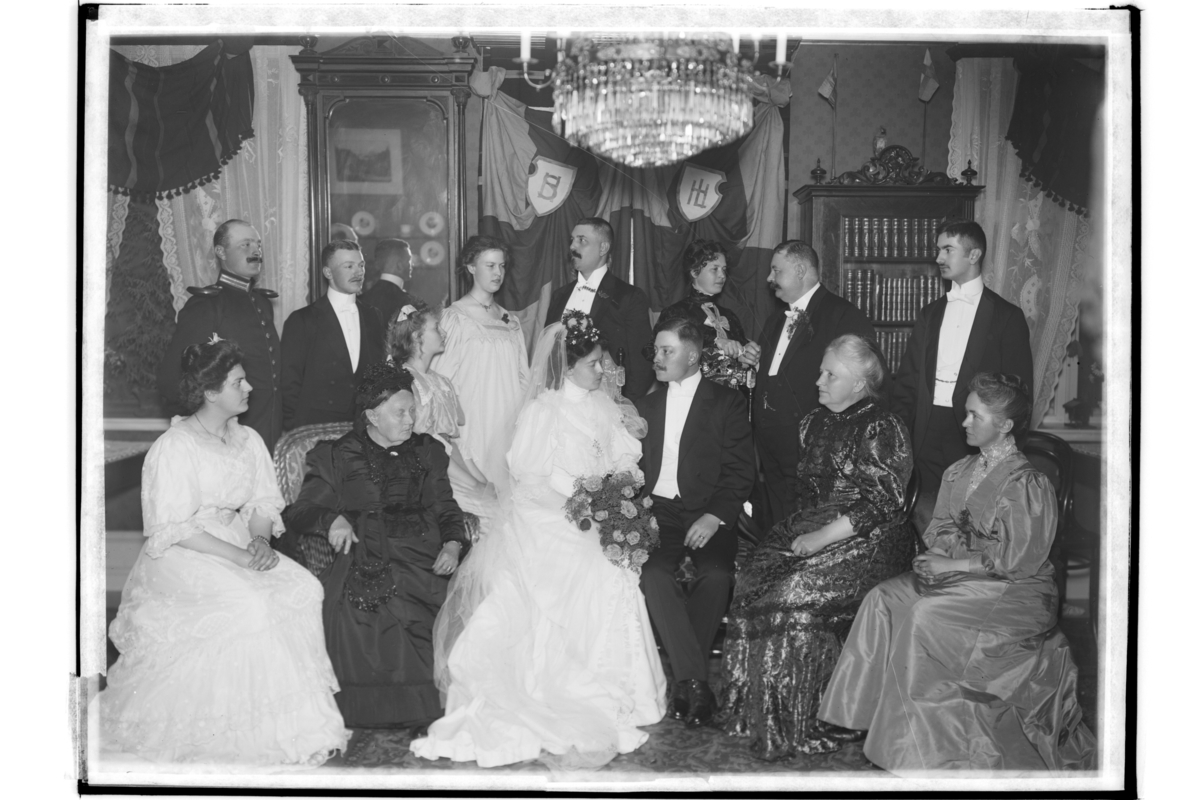 Bröllop. Brudpar och 12 gäster. Bruden helt i vitt med slöja och krona. Brudgummen i frack.