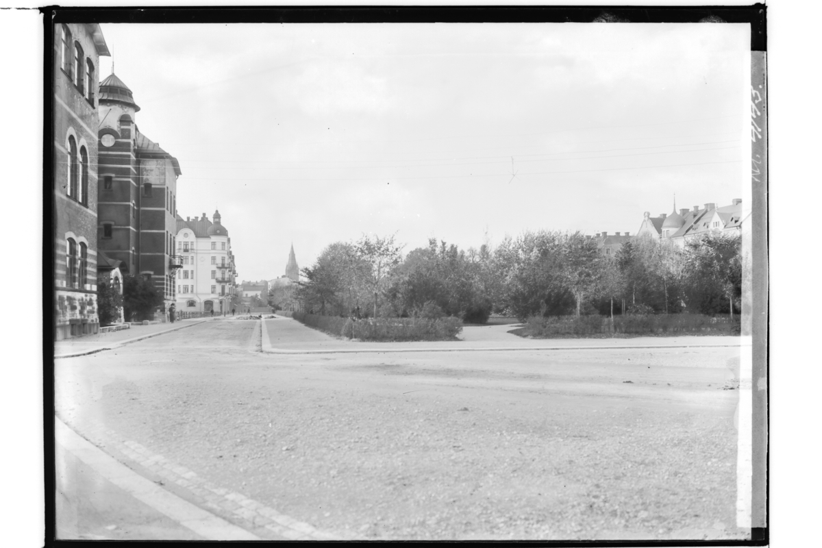 Flickskolan och ett fyrvånings stenhus till vänster.