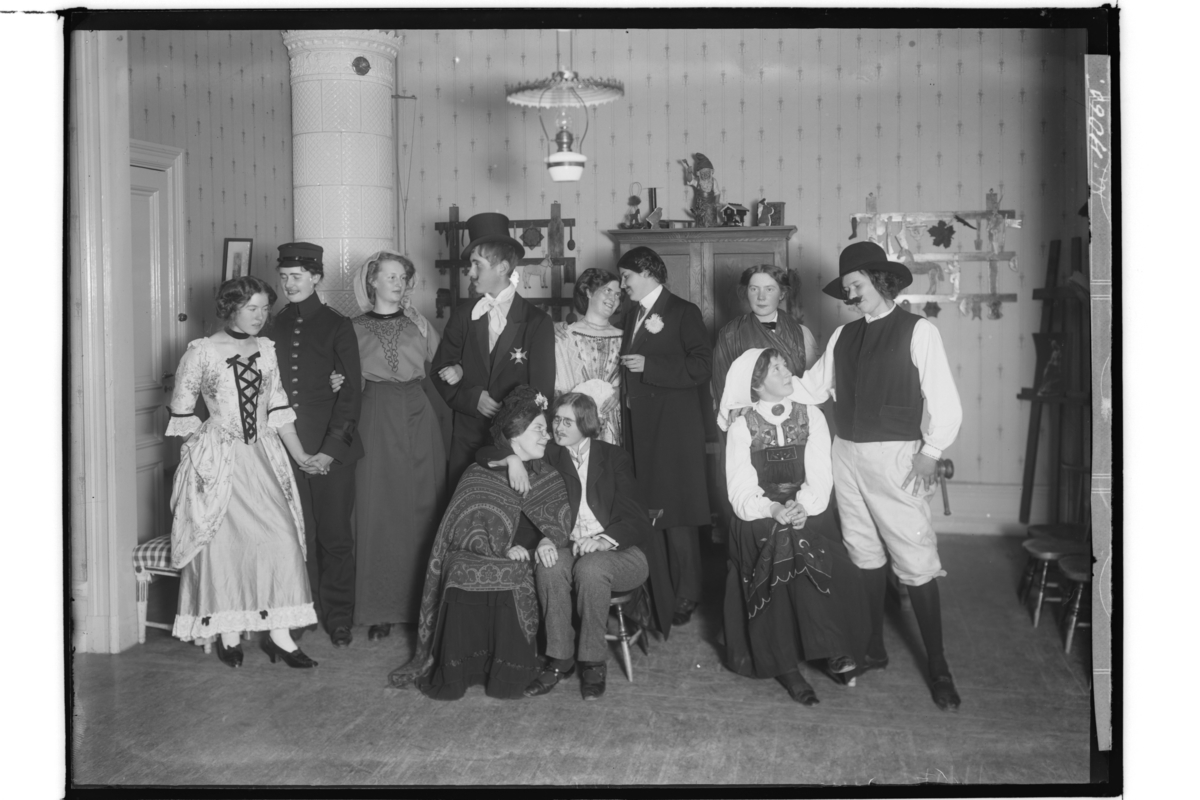 Rumsinteriör, maskerad, 11 utklädda flickor.