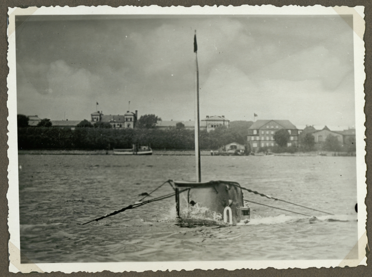 Bilden visar den tyske Ubåten U 9 av typ II B. Båten går nästan i undervattensläge så att bara tornet sticker utanför vattenytan.