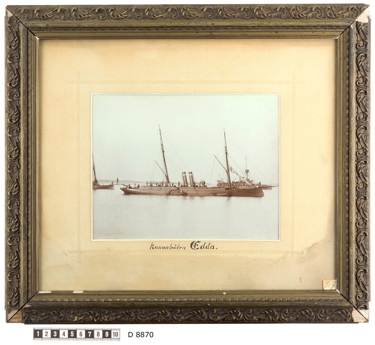 Fartygsporträtt som visar kanonbåten Edda till ankars. Fartyget syns från babordssidan där två skeppsbåtar ligger förtöjt. I bakgrunden syns ett skärgårdslandskap och ytterligare två kanonbåtar.