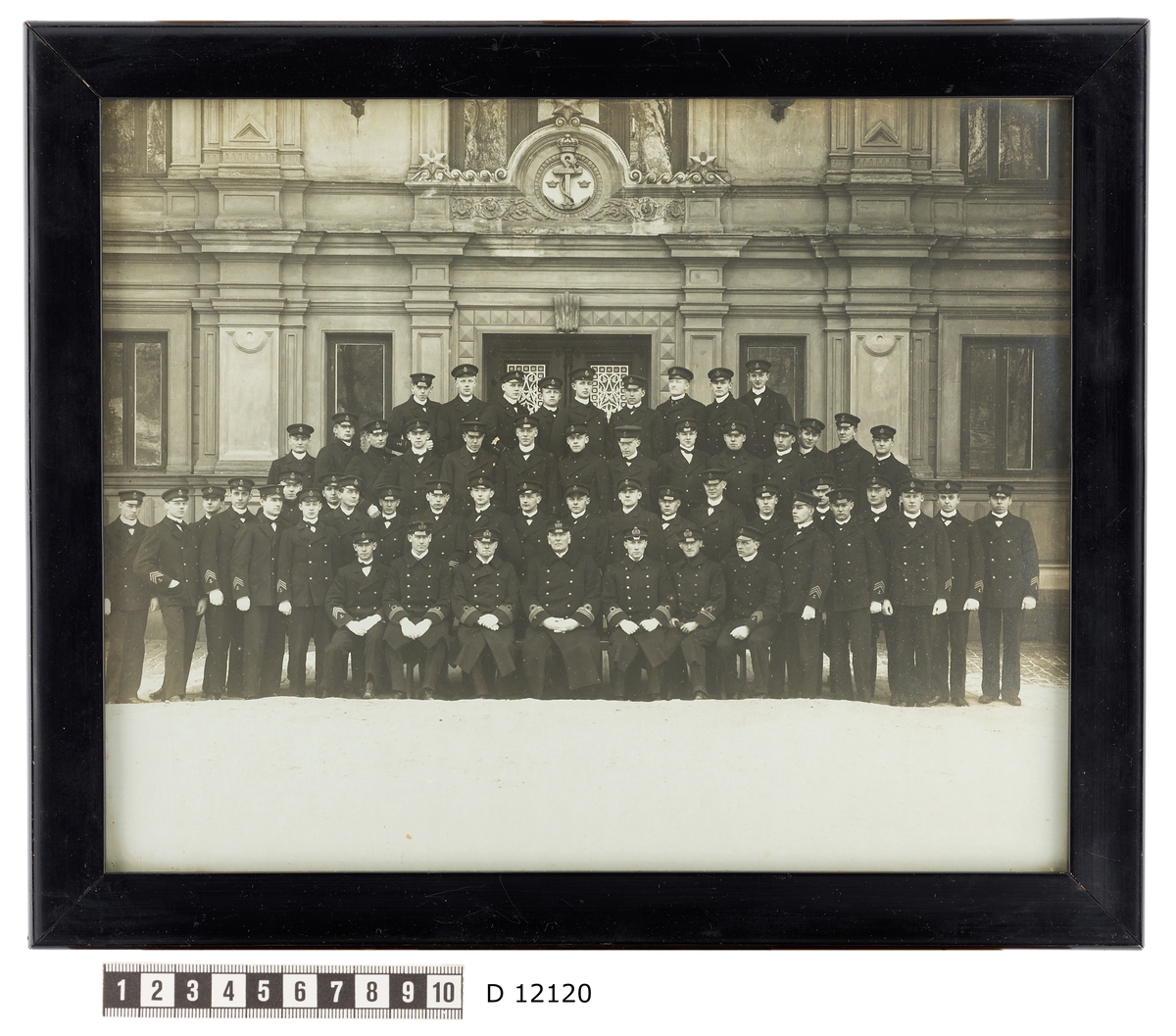 Bilden förställer en grupporträtt av svenska sjöofficerare och underofficerare framför sjökrigsskolan i Stockholm.