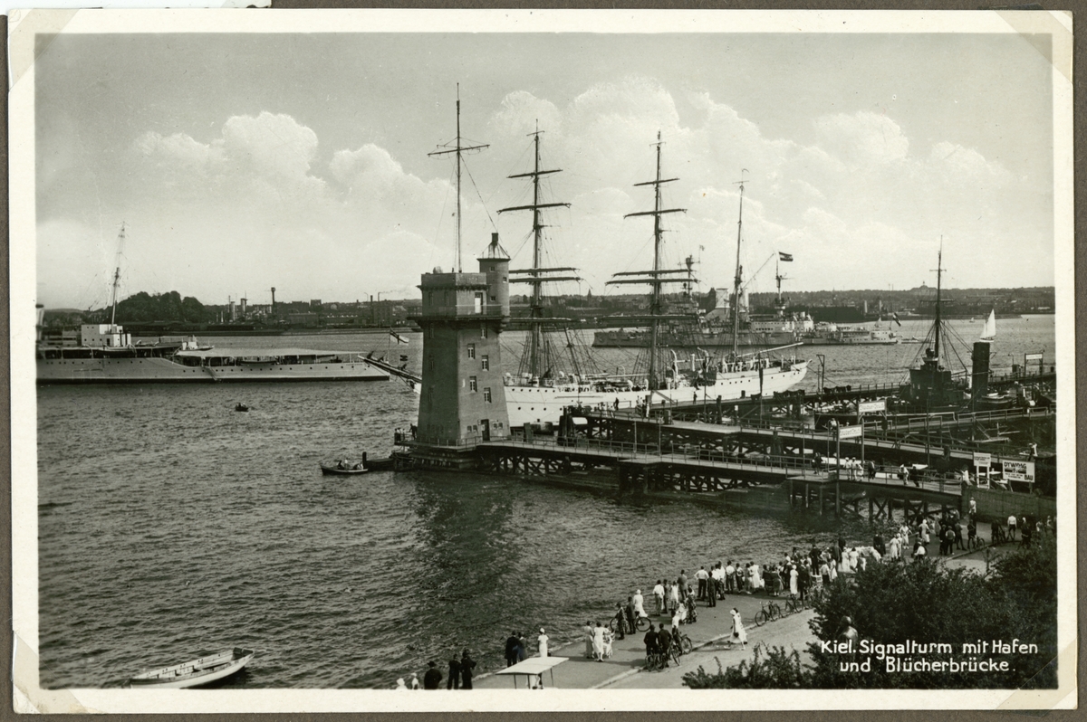 Titel: Bilden visar hamnen i Kiel med fyrtorn och båtbryggan "Blücherbrücke".