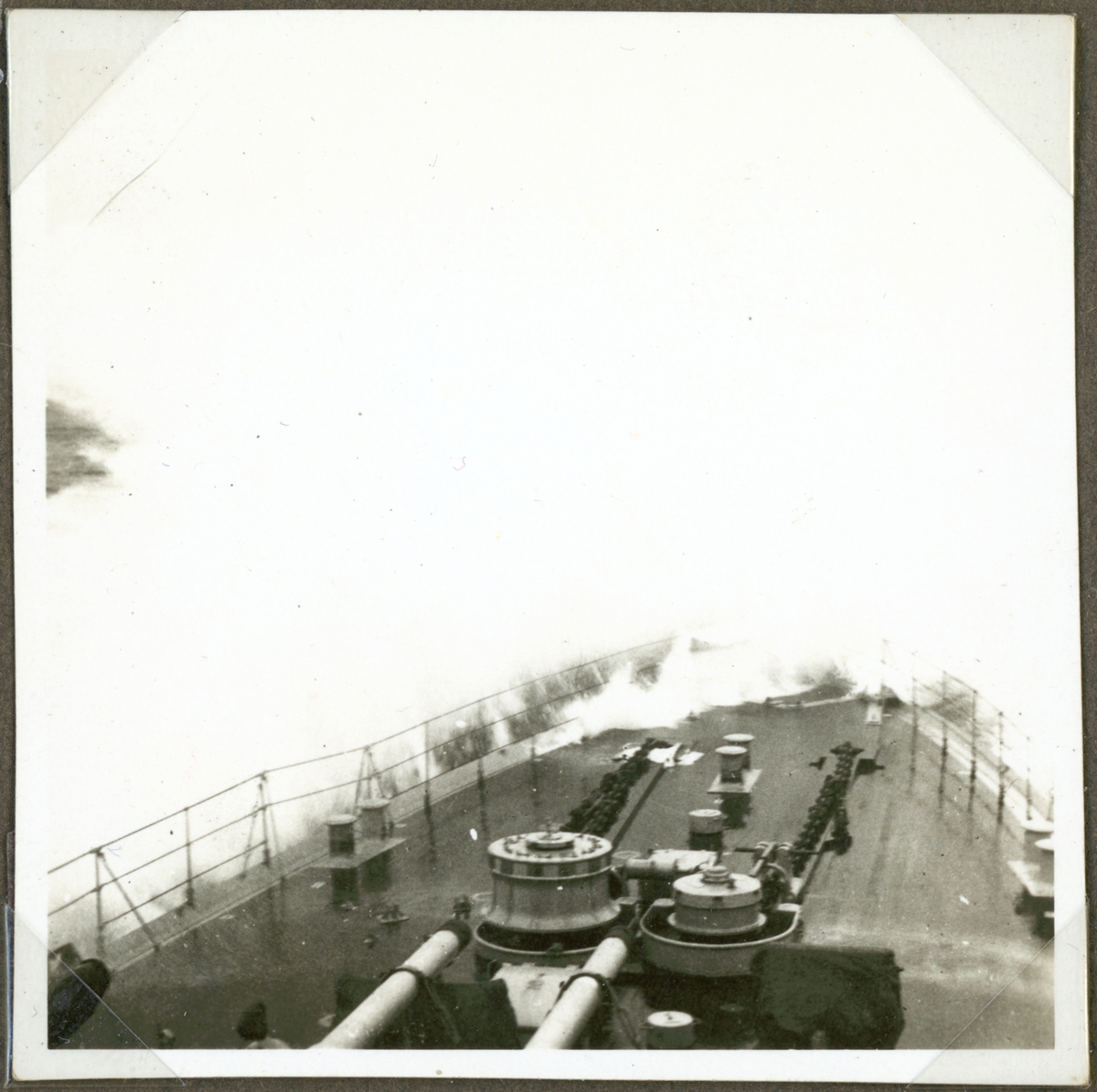 Titel: Bilden visar förskeppet av flygplanskryassaren Gotland i hård väder.