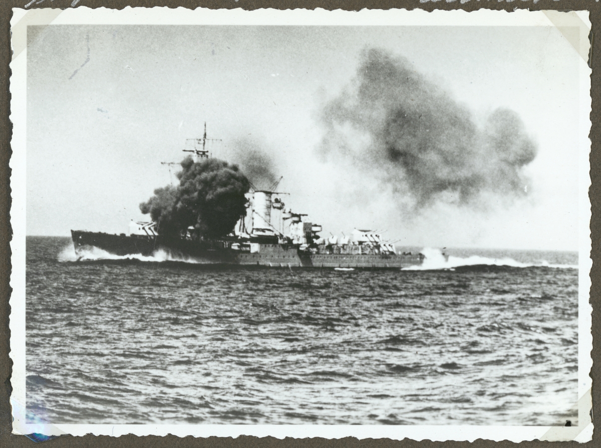 Bilden visar det tyske lätt kryssare Karlsruhe som precist har avlossat sina kanoner. Svarta rökmoln stiger mot himmelen.