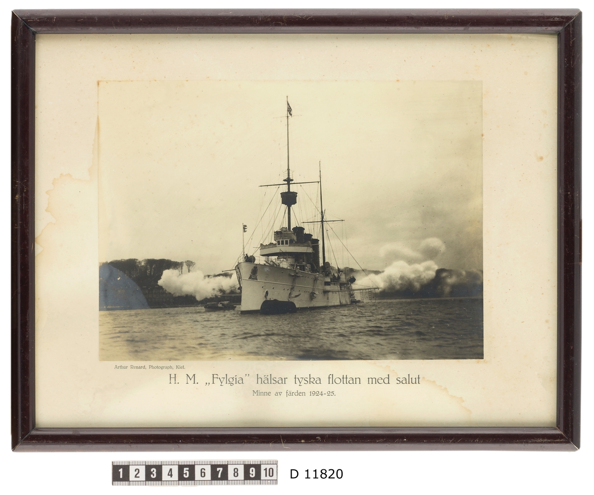 Bilden visar pansarkryssaren Fylgia snedd framifrån. Hon skjuter salut med pjäserna på båda sidor och är omgiven av stora rökmoln.