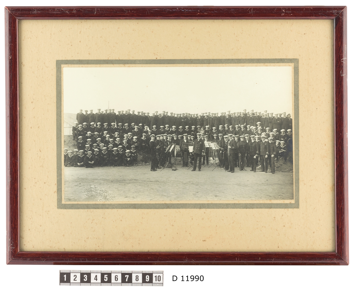 Bilden visar officerare, underofficerare och manskap huvudsakligen ur kustartilleriet uppställda kring musikkapell med dirigent. I mellersta raden bakom dirigenten står ett barn. Manskapet bär bussarong och rundmössa med vit kapell.