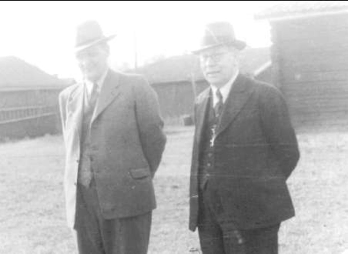 Rektor Jonathan Cedegren och kyrkoherde Lindqvist i Fellingsbro framför hembygds- och husarmuseum.