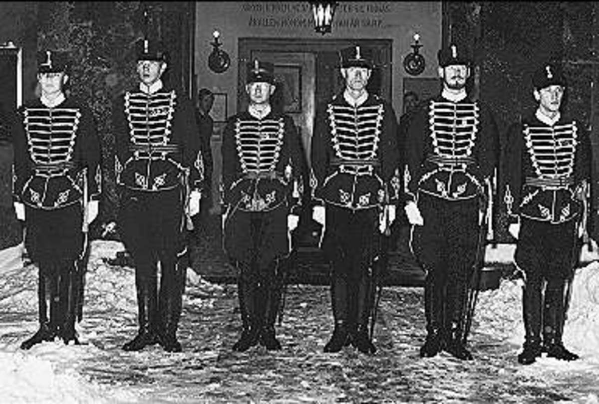 Standarförare och standarvakt utanför Sankta Elins Kyrka i Skövde.