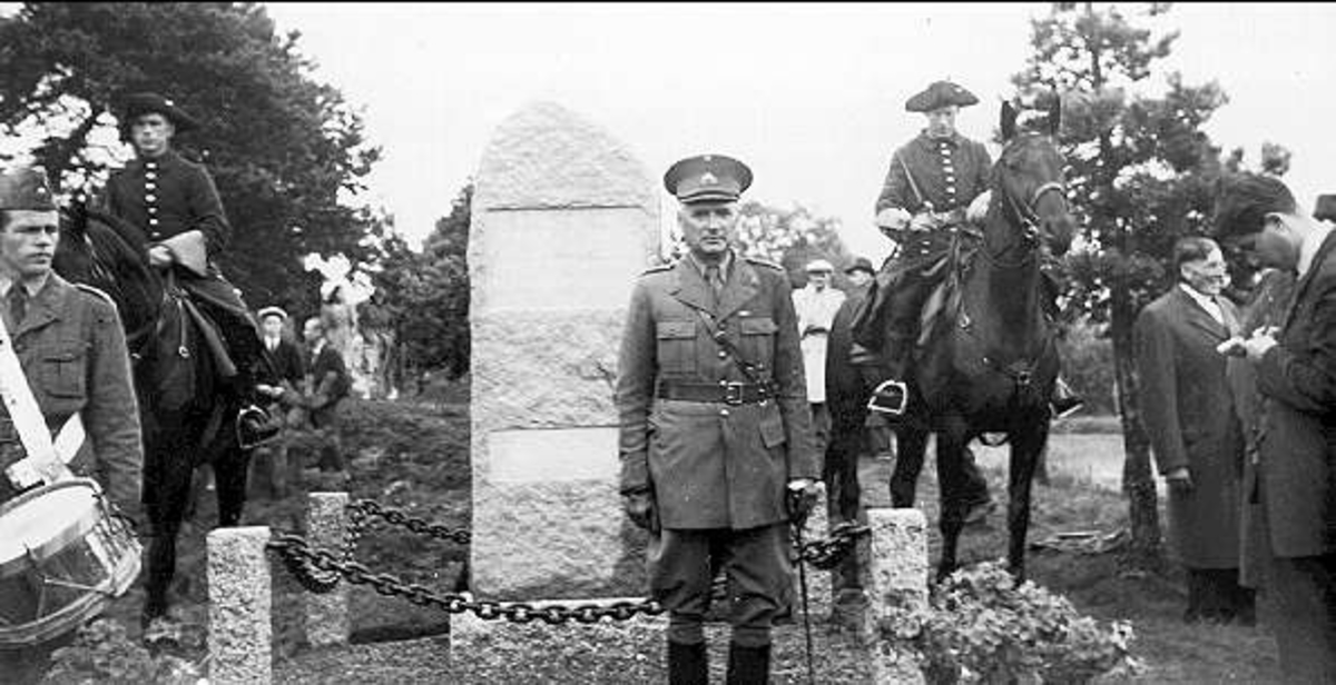 Vid Karolinermonumentet i Märsta. F.d. Sekundchefen K 1 Överste C-A Torén framför Karolinermonumentet i Märsta, medan skvadronen till häst, hemvärnsmän och kamratföreningen paraderar förbi.