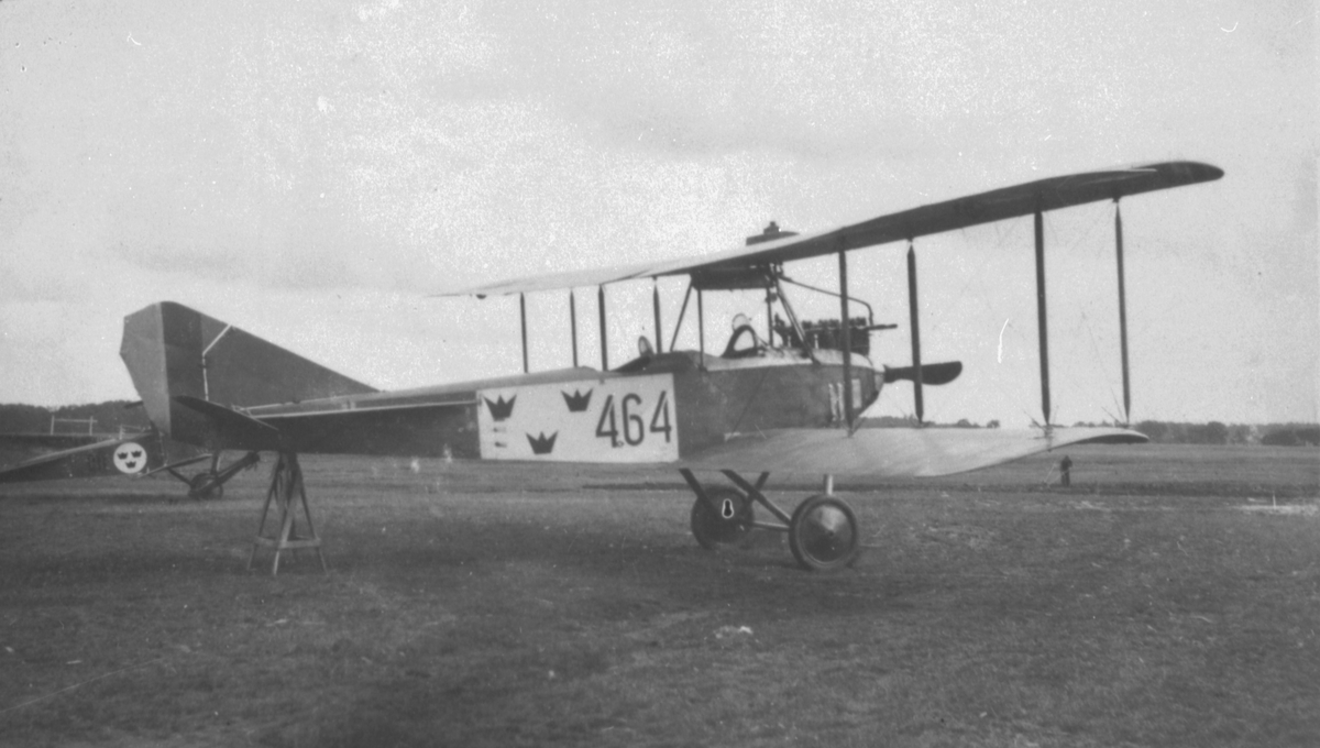 Flygplan FVM Allbatros 120 märkt 464 står på en bock på flygfältet på Malmen.