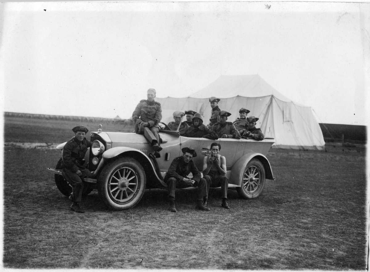 Flygsoldater i Flygkompaniets bil framför tälthangar på Rinkabys flygfält, 1925.
