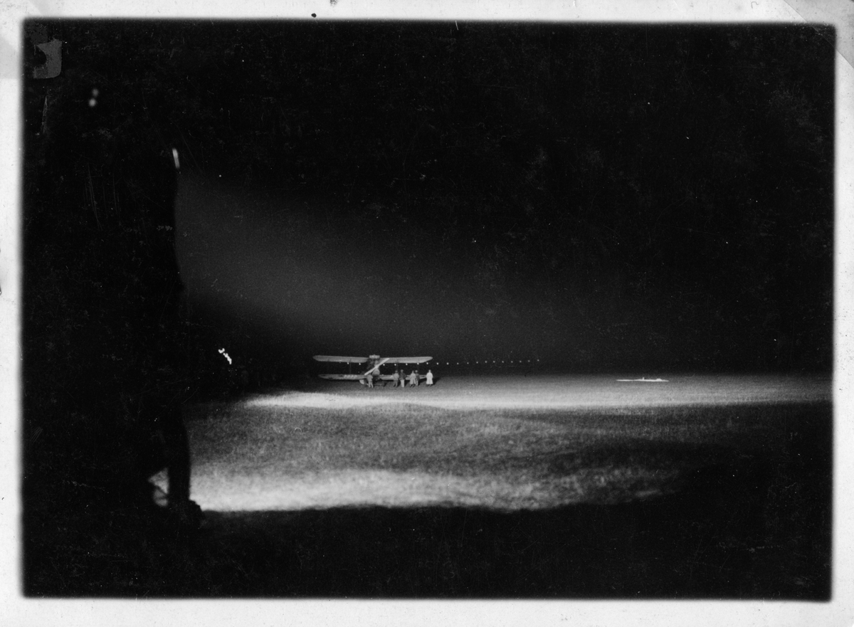 Klargöring av militärt flygplan på flygfält inför mörkerflygning för Flygkompaniet. Militärer i rörelse vid flygplanet.