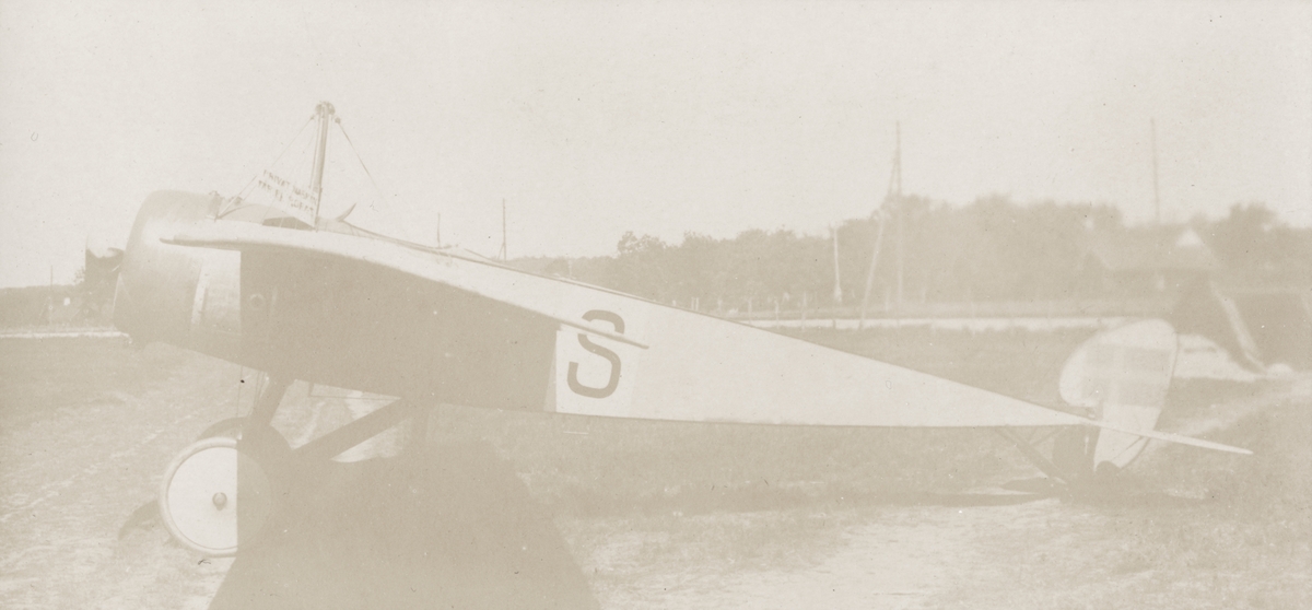 Flygplan Thulin K tillhörande Enoch Thulin står på flygfältet i Ljungbyhed, 1918. Vy från sidan.