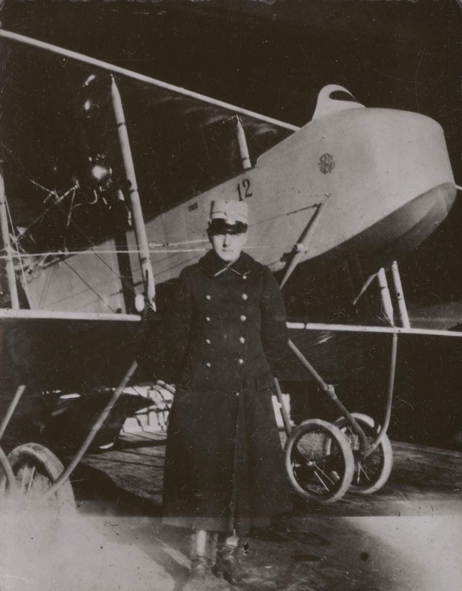 Militäre flygföraren Nils Kindberg står bredvid flygplan SW 10 Farman nr 12 i en hangar på Flygkompaniet på Malmen, 1915.