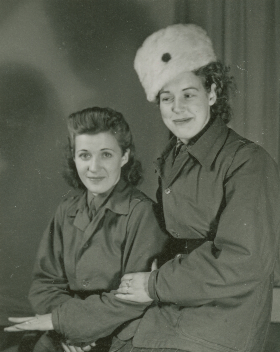 Porträttfoto av två frivilliga luftbevakare ur 91:a ls-kompaniet, stationerade i Tellejåkk, Kåbdalis under beredskapen, 1942. Klädda i uniform. Till vänster Karin Olsson, till höger Karin Nordberg. Klädda i militäruniform.