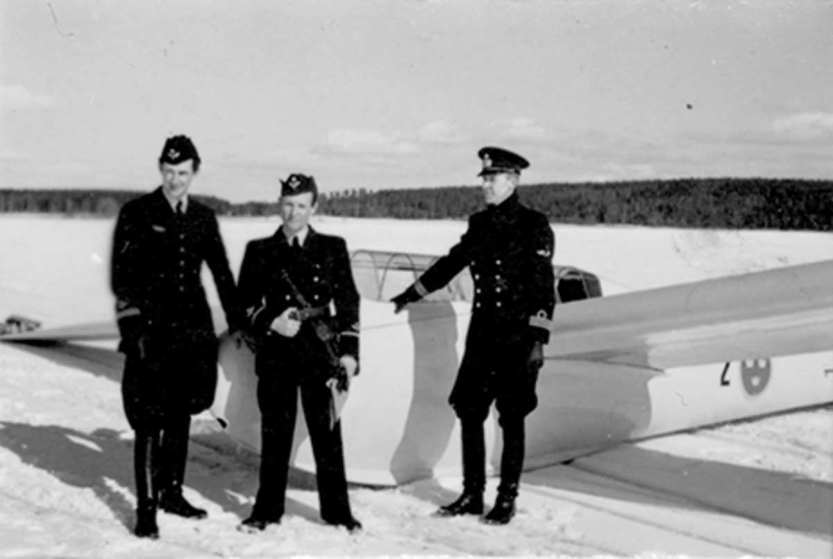 Grupporträtt; tre män framför segelflygplan Se 103.