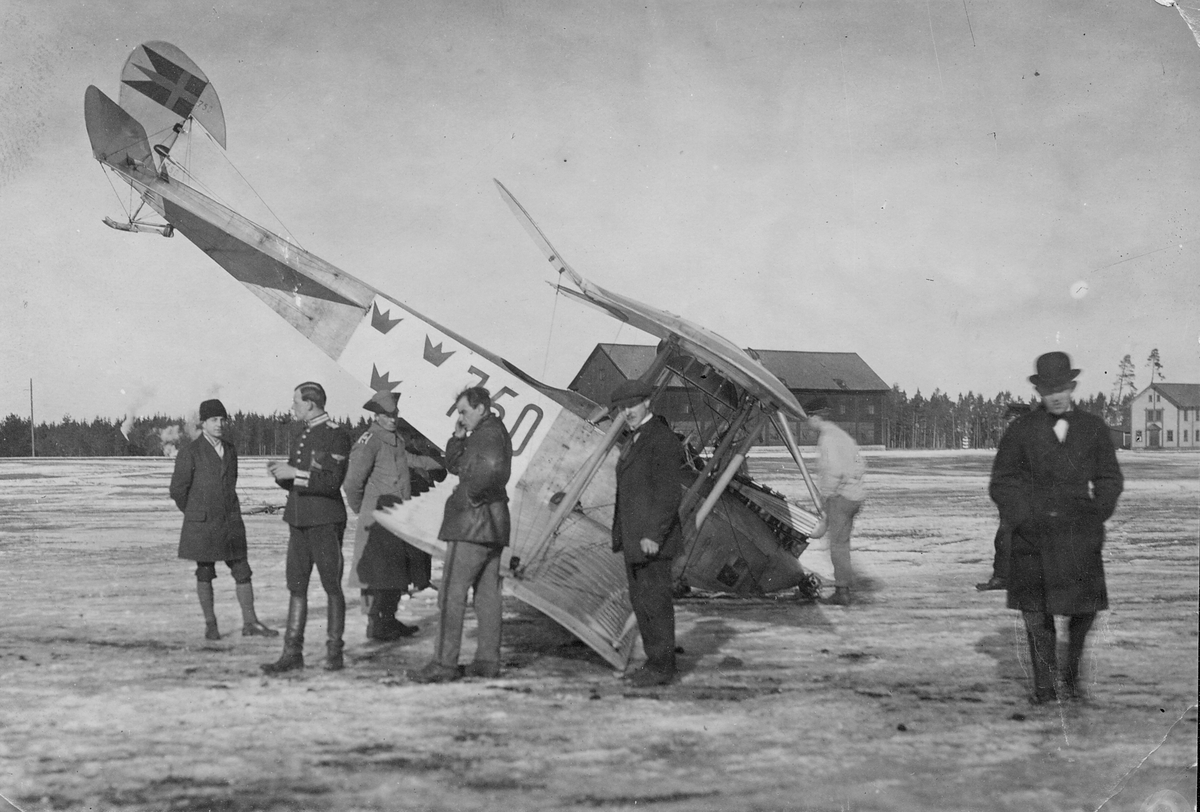 Flygplan Albatros SW 20 nummer 750 har landat på nosen på Flygkompaniet på Malmen, vintertid 1919. Folksamling vid flygplanet. Från vänster verkmästare Jonasson, löjtnant Tor Klintberg, furir Seigertz, flygförare Mats E. Berg, verkmästare Theodor Pettersson. I bakgrunden syns Röda förrådet.