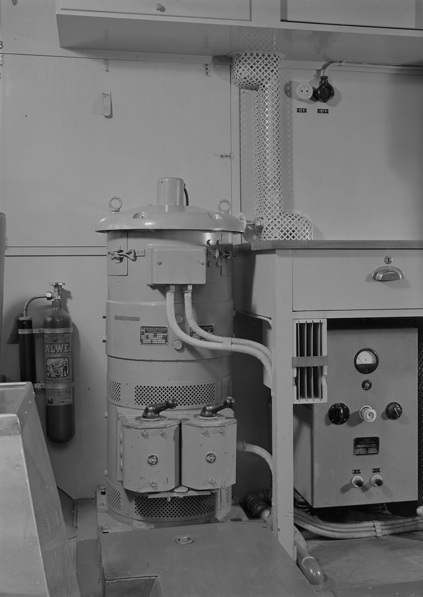 Interiör av fotobil modell m/45. Från vänster till höger: eldsläckare, generator, likriktare.