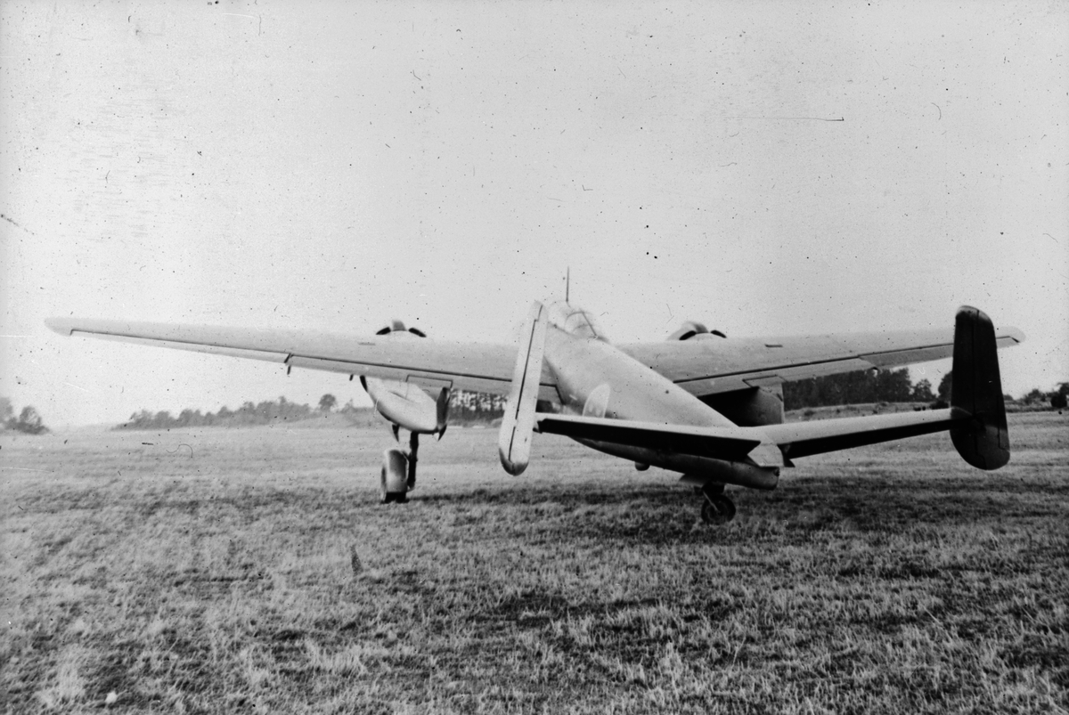 Bombflygplan B 18A står på ett fält. Vy bakifrån.