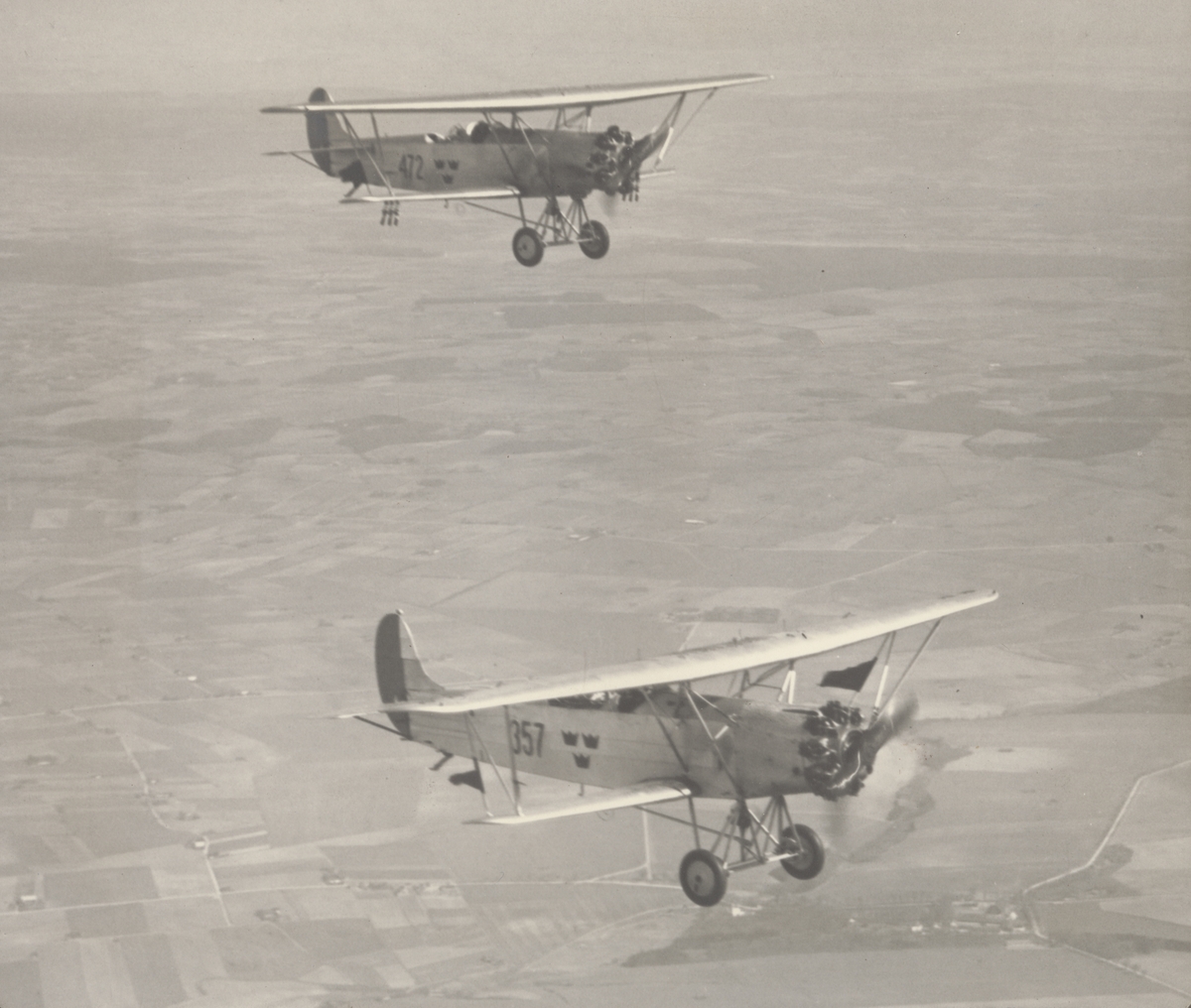 Flygbild av två flygplan S 6, Fokker C.VE i luften över landskap, 1930. Flygplan nr 357 och 472.