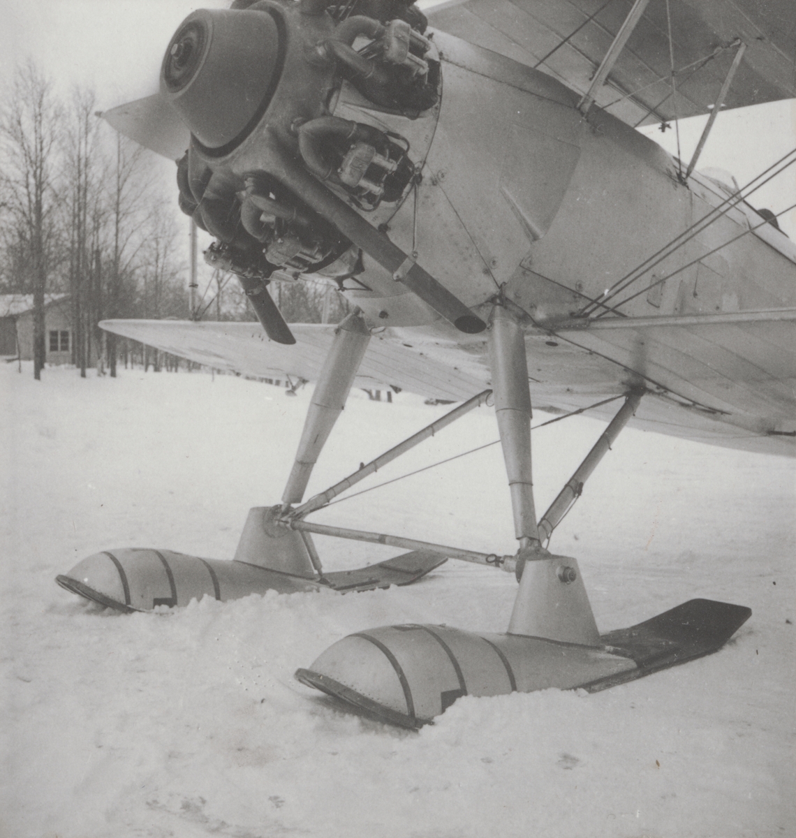 Närbild av flygplan Svenska Aero - Jaktfalken, med skidor.