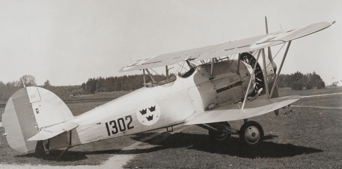 Flygplan S7, Hawker Hart märkt nummer 1302 står på ett flygfält. Vy snett bakifrån.