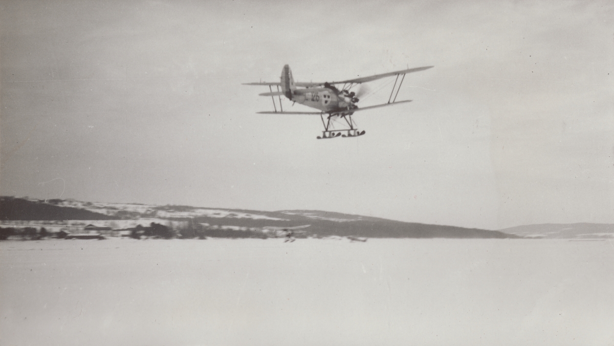 Flygplan J 7, Bristol Bulldog nummer 1215 med skidor över flygfältet på F 4 Frösön, vintertid.