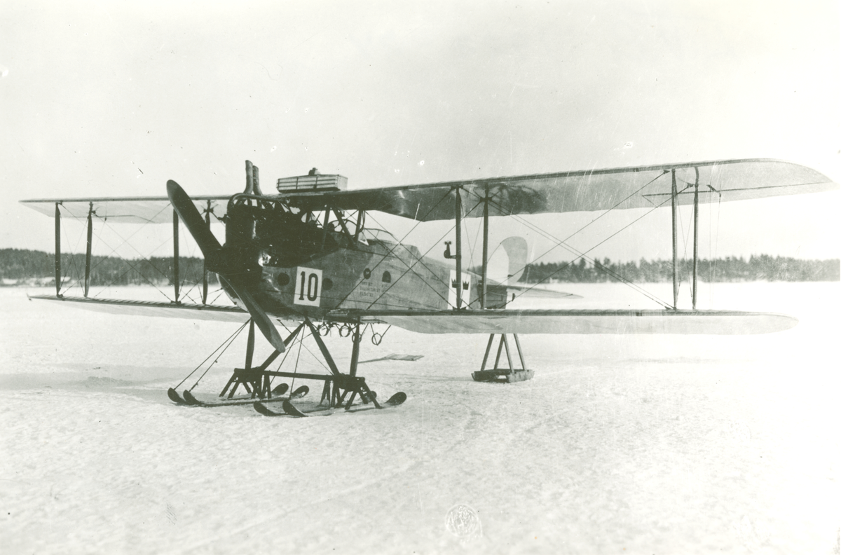 Marint flygplan LVG C.VI märkt nummer 10 med skidor står uppställt på isen vid Hägernäs, 1921.