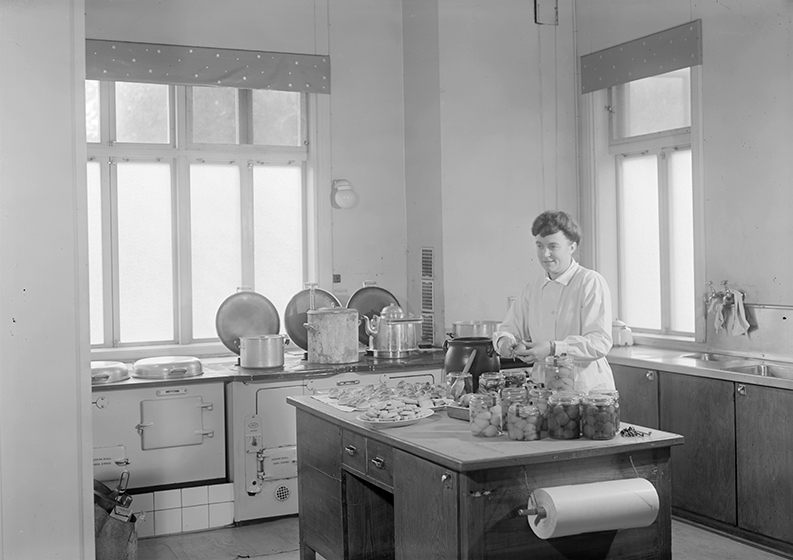 Officermässens kök på F 3 Malmen, 1945. Kokerska i arbete med matkonservering. 2 bilder. Interiör.