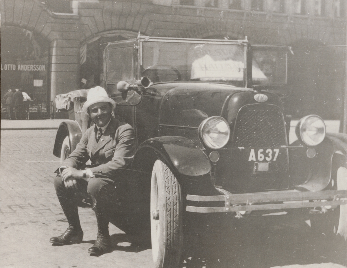 Porträttfoto av militären Nils Kindberg, sittandes på en bil, 1925.