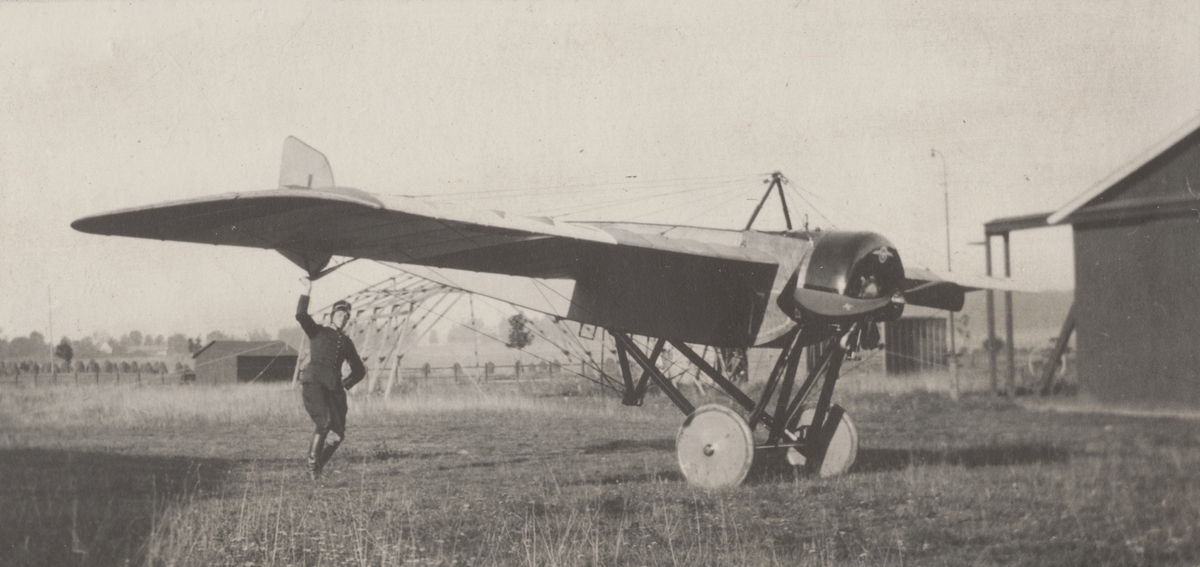 En man håller upp flygplan Thulin B i stjärtfenan. På ett flygfält cirka 1915-1918.